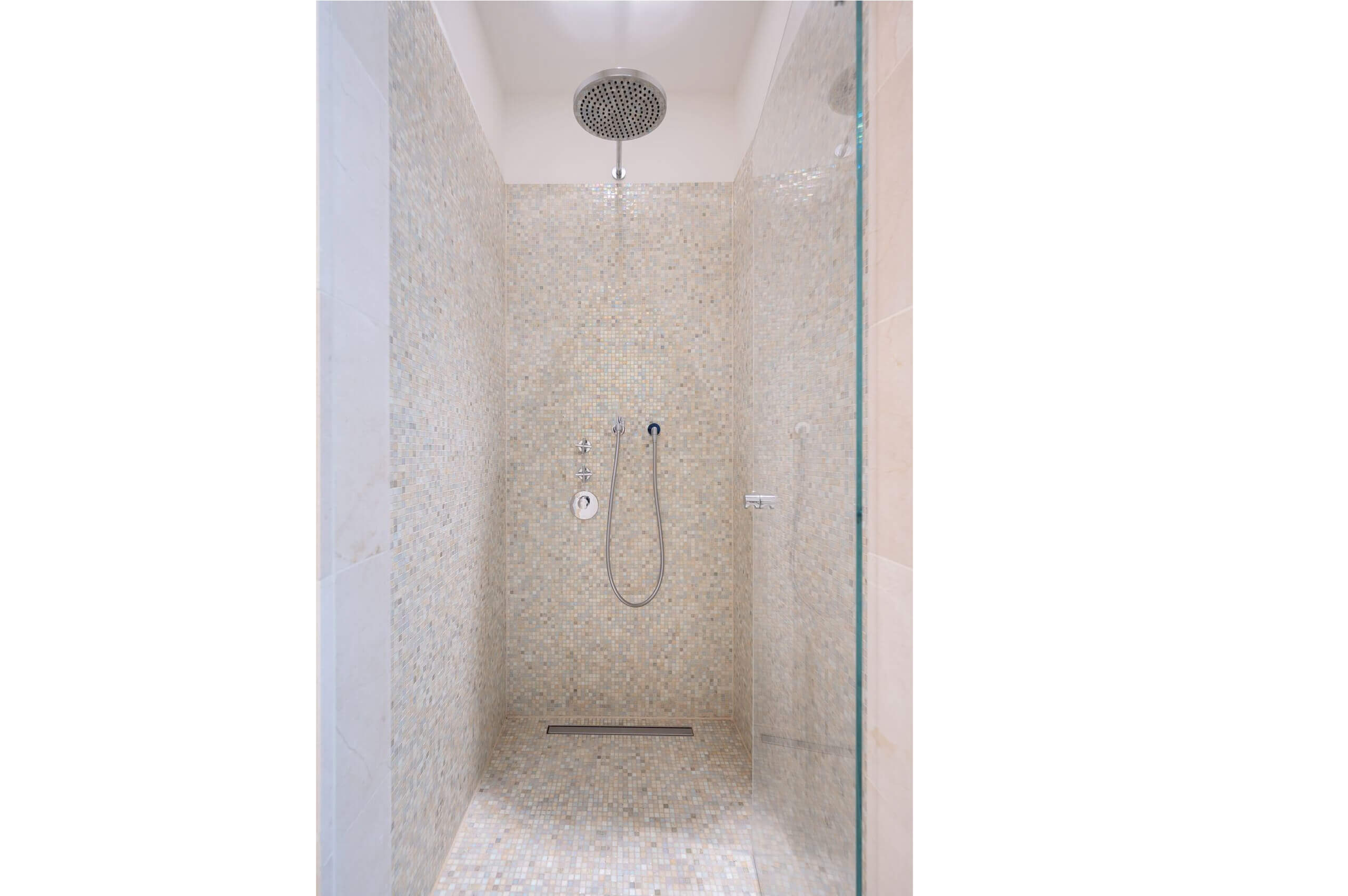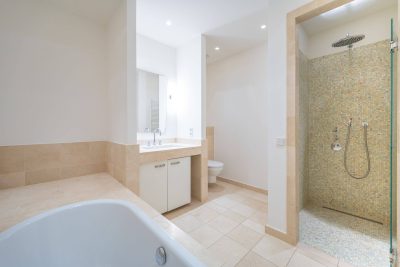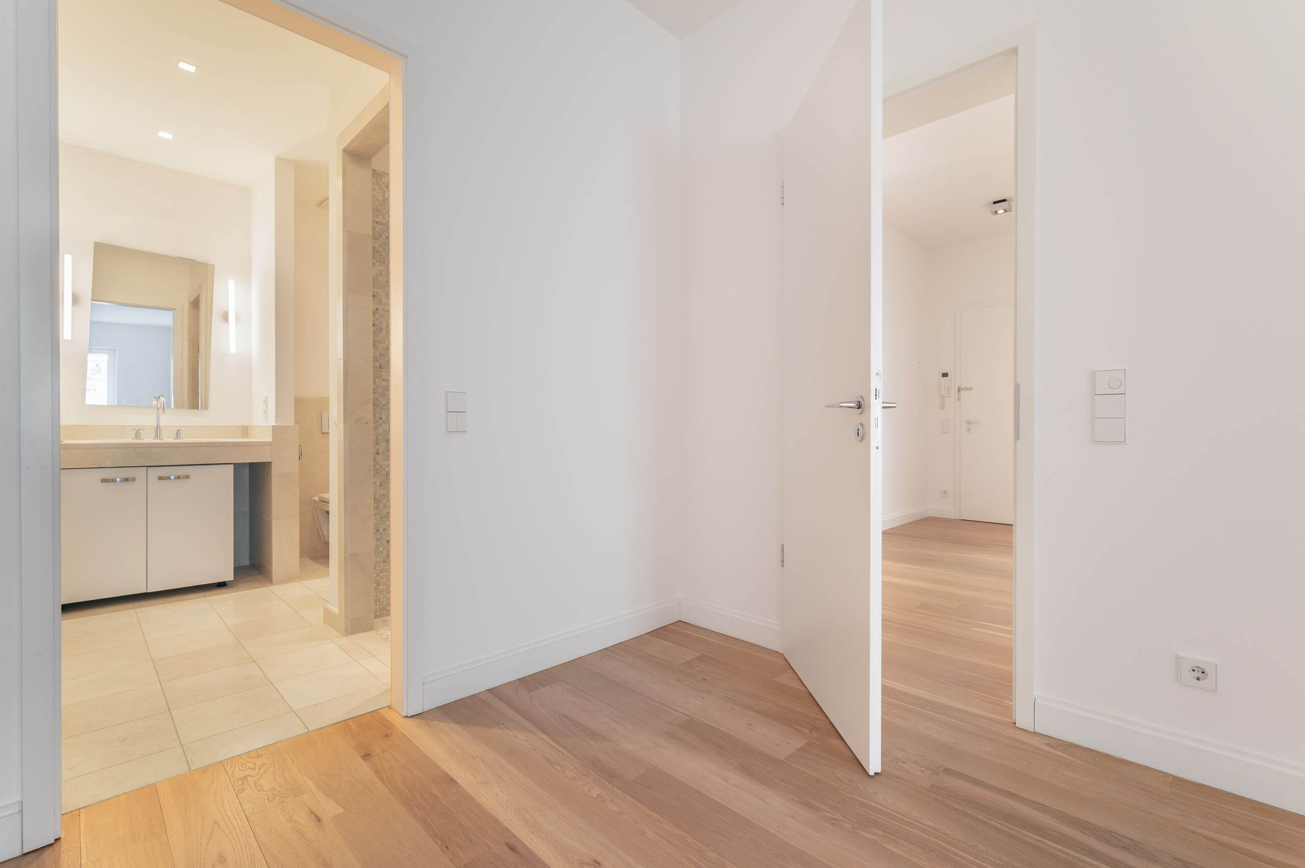 Das Schlafzimmer besitzt einen Direktzugang zum Masterbad. Das Masterbad verfügt neben einer Dusche auch über eine große Badewanne. Zusätzlich besitzt die Wohnung ein weiteres Duschbad. Die mit viel Liebe zum Detail ausgewählten Markenarmaturen (Dornbracht), hochwertigen Natursteinböden und -wände, entspannenden Regenduschen und komfortable Badewanne verwandelt die Bäder in wahre Wellnessoasen. Zwei weitere Zimmer ergänzen einen Lebensraum, der eine perfekte Symbiose von Eleganz, Luxus und Urbanität bietet. In den Wohnräumen ist hochwertiger Eiche-Parkettboden mit einer umlaufenden 12 cm hohen Holzsockelleiste verlegt. Für eine wohlige Wärme sorgt die Fußbodenheizung, die umweltschonend und effizient über Fernwärme betrieben wird.