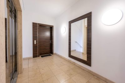 - Mondänes, lichtdurchflutetes Treppenhaus mit frei stehendem Aufzug