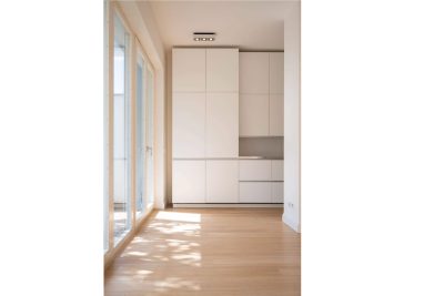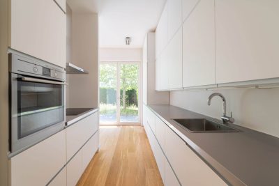 In den Kochblock sind sowohl das Kochfeld als auch viel praktischer Stauraum integriert. Darüber befindet sich eine Abzugshaube, die flach unter der Decke montiert ist und sich optisch elegant zurücknimmt. Im angrenzenden Hauswirtschaftsraum finden Ihre Waschmaschine /Trockner sowie Vorräte und Haushaltsutensilien Platz.