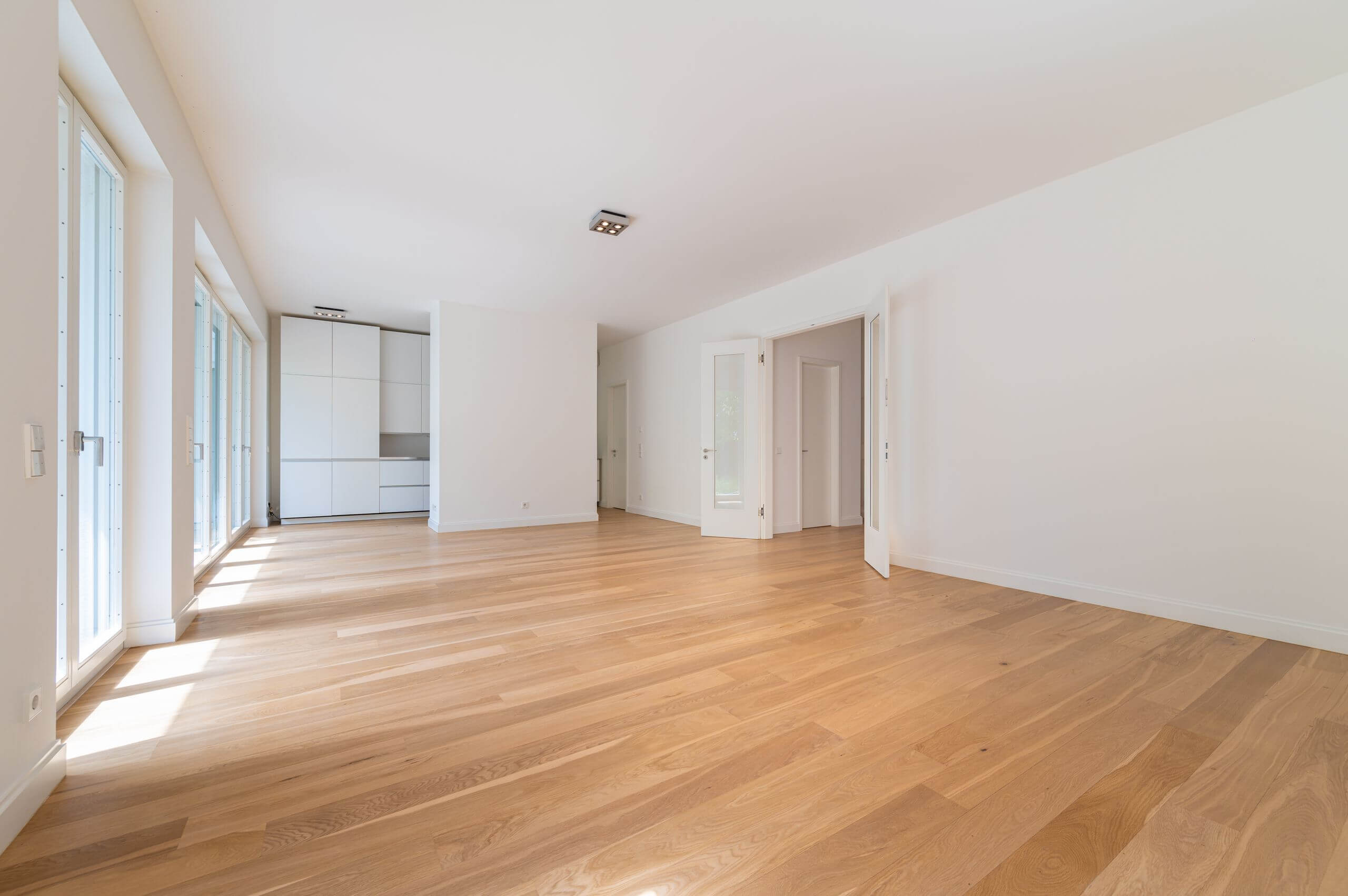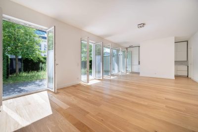 Die bodentiefen Fenster und zweiflügeligen Innen-/Außentüren, die auf die Terrasse und in den Garten führen, durchfluten den Raum im Wohnzimmer mit Licht; die Raumhöhen bis zu 2,95 Meter unterstreichen die Weitläufigkeit der Wohnung. Die traumhafte, offen konzipierte Küche ist mit einer hochwertigen Einbauküche ausgestattet. Optisch wird die Küche durch einen Küchenblock vom Ess-/und Wohnbereich getrennt.