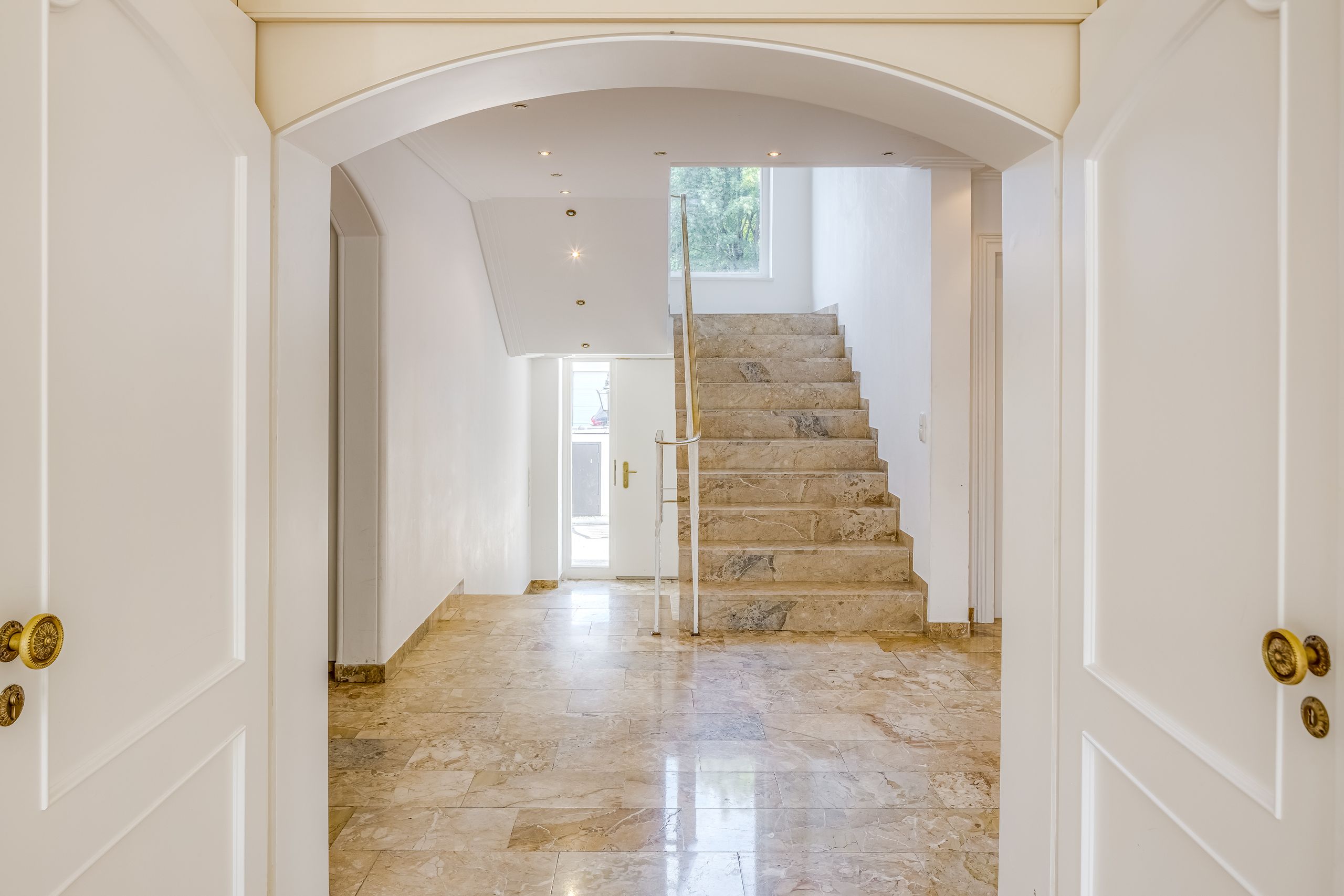 - Naturstein-Treppenhaus (Travertin ‚Nocciole‘) mit weiß-goldenem schmiedeeisernen Geländer