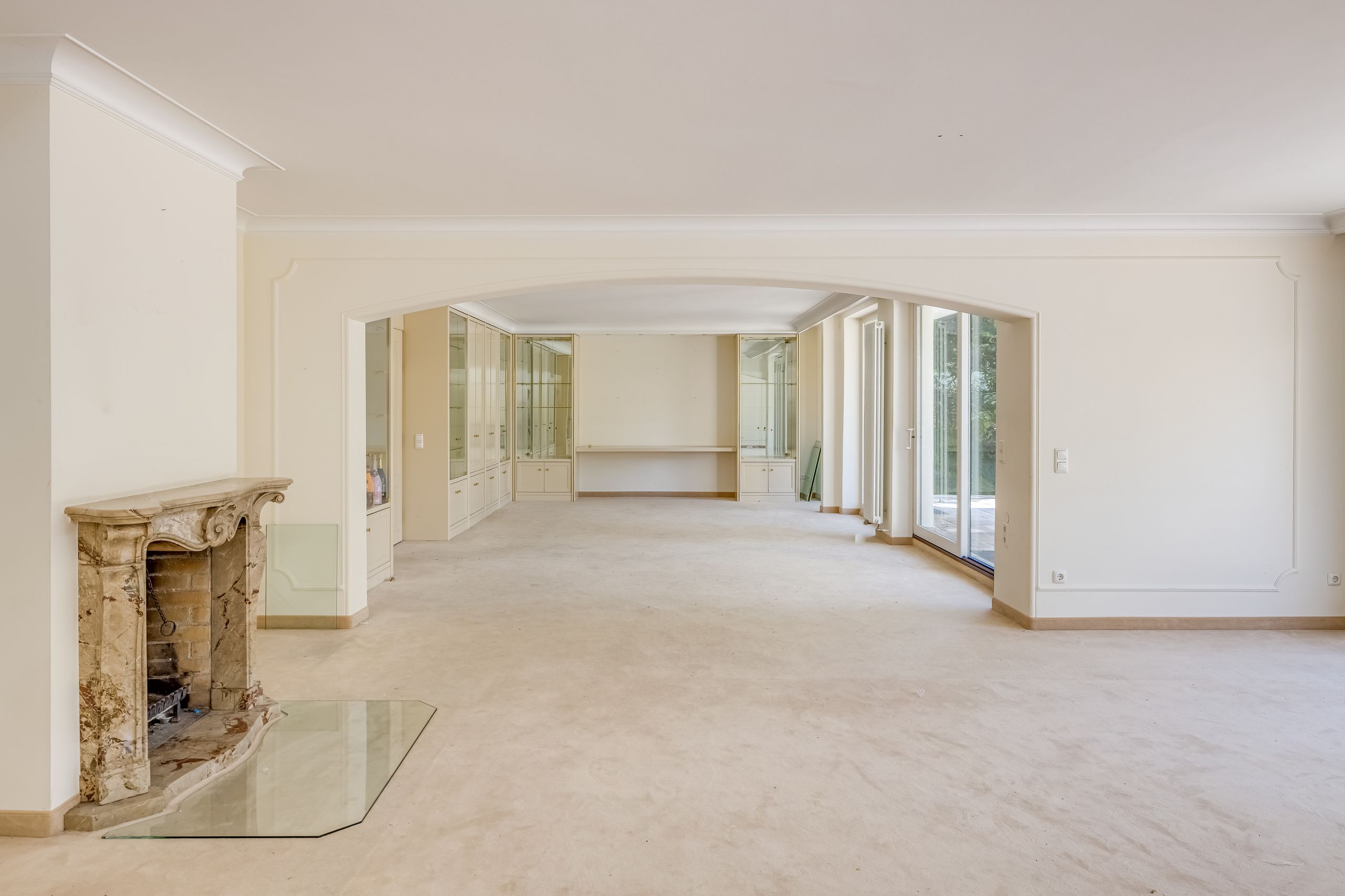 Die Räumlichkeiten zeigen sich mit perfekter Süd-West-Ausrichtung lichterfüllt und weitläufig. Die Innenausstattung ist ausgesprochen gepflegt, jedoch nicht mehr zeitgerecht. Sie umfasst unter anderem Marmor- und Teppichböden, helle Maßeinbauten sowie einen offenen Kamin.