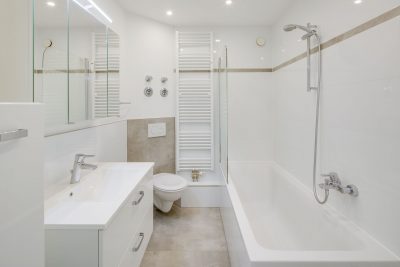 - weiß gefliestes Bad mit Acrylbadewanne und WC