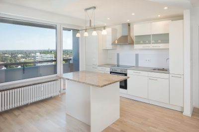 Die offene Einbauküche in elegantem Hochglanzweiß besitzt ein großes Cerankochfeld und kommt in Vollausstattung mit sämtlichen Geräten sowie Über- und Unterschränken. Besonders angenehm ist der direkte Zugang zum ersten Balkon. Von hier läßt es sich im Sommer gemütlich Frühstücken und die Sonnenaufgänge zu zweit genießen. Ein besonderer Blickfang ist die von allen Seiten begehbare Kücheninsel mit massiver Granitplatte.